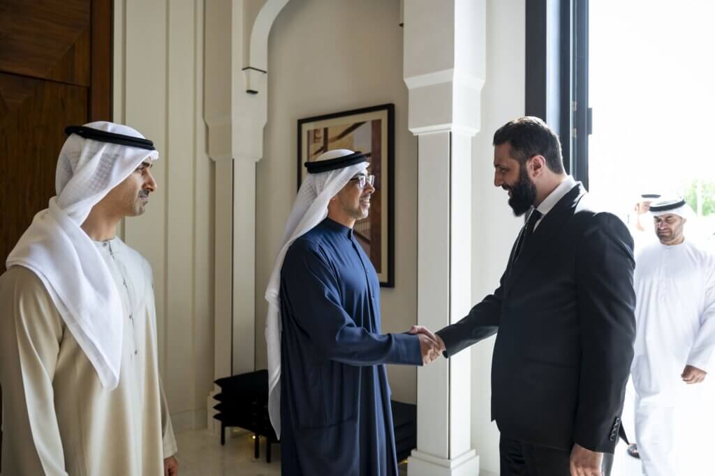 حضر اللقاء..سمو الشيخ منصور بن زايد آل نهيان نائب رئيس الدولة نائب رئيس مجلس الوزراء رئيس ديوان الرئاسة وسمو الشيخ عبد الله بن زايد آل نهيان نائب رئيس مجلس الوزراء وزير الخارجية وسمو الشيخ حمدان بن محمد بن زايد آل نهيان نائب رئيس ديوان الرئاسة للشؤون الخاصة ومعالي الشيخ محمد بن حمد بن طحنون آل نهيان مستشار رئيس الدولة ومعالي علي بن حماد الشامسي الأمين العام للمجلس الأعلى للأمن الوطني ومعالي الدكتور أنور بن محمد قرقاش المستشار الدبلوماسي لصاحب السمو رئيس الدولة ومعالي ريم بنت إبراهيم الهاشمي وزيرة دولة لشؤون التعاون الدولي ومعالي محمد بن مبارك المزروعي وزير دولة لشؤون الدفاع ومعالي خليفة بن شاهين المرر وزير دولة ومعالي الدكتور أحمد مبارك المزروعي رئيس مكتب رئيس الدولة للشؤون الاستراتيجية رئيس مكتب أبوظبي التنفيذي ومعالي لانا نسيبة مساعدة وزير الخارجية للشؤون السياسية وسعادة حسن الشحي سفير الدولة لدى الجمهورية العربية السورية وعدد من كبار المسؤولين .. كما حضره الوفد المرافق للرئيس السوري الذي يضم معالي أسعد الشيباني وزير الخارجية وعدداً من المسؤولين.