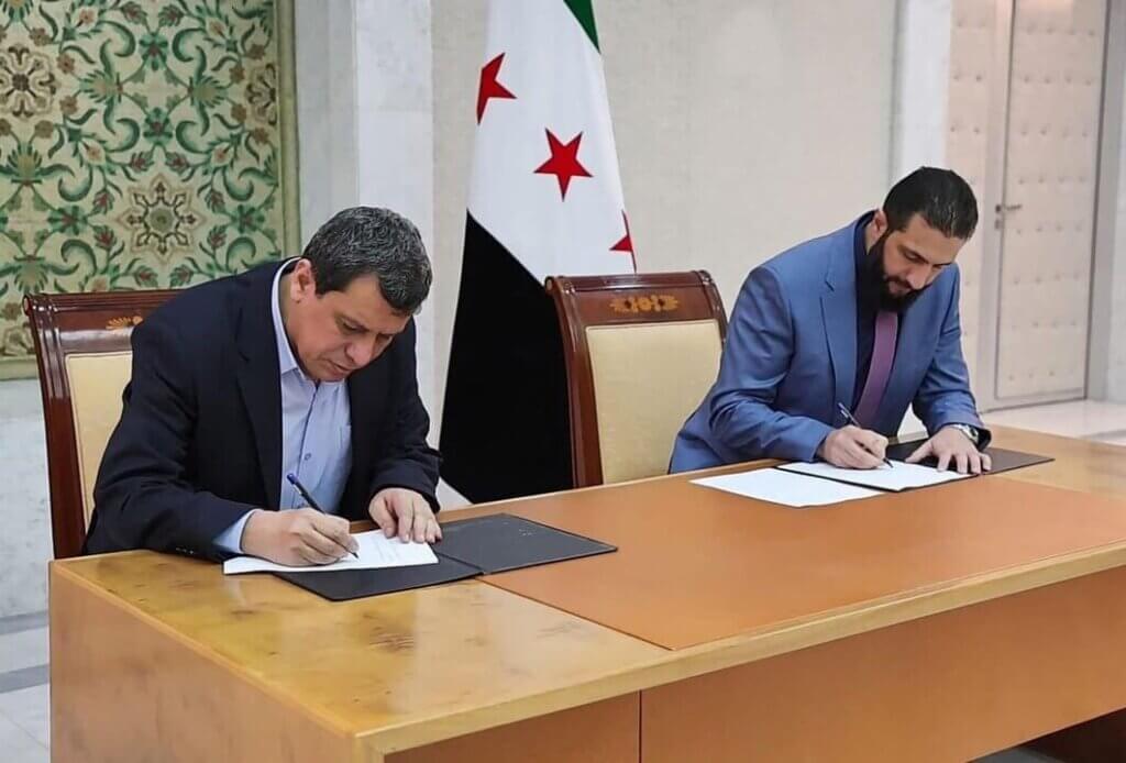 وقع أحمد الشرع رئيس الجمهورية العربية السورية للمرحلة الانتقالية ومظلوم عبدي قائد قوات سوريا الديموقراطية الاثنين اتفاقا يقضي “بدمج” كافة المؤسسات المدنية والعسكرية التابعة للإدارة الذاتية الكردية في إطار الدولة السورية، وفق ما أعلنت الرئاسة.