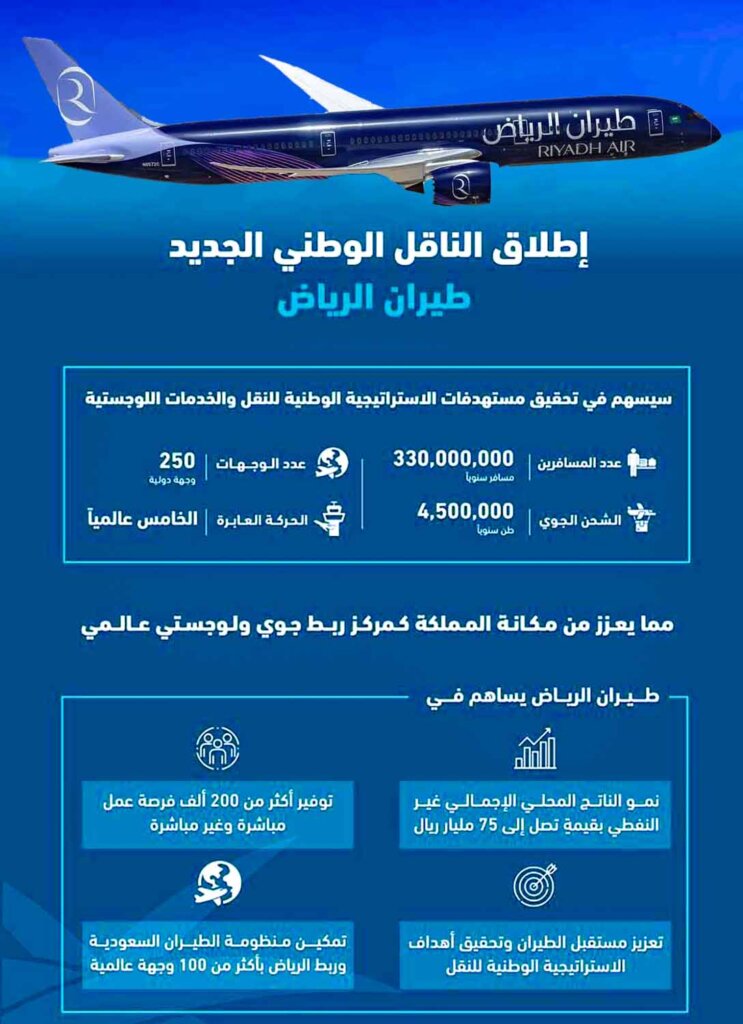 كما سيسهم إطلاق “طيران الرياض” في إتاحة المزيد من الفرص للسياح والزائرين من جميع أنحاء العالم للوصول إلى أجمل المواقع السياحية والطبيعية في المملكة، لتشكل حقبة جديدة في مجال السفر والطيران، عبر زيادة خيارات النقل الجوي تزامناً مع زيادة أعداد المسافرين من المملكة وإليها، ورفع الطاقة الاستيعابية لخدمات النقل والشحن والخدمات اللوجستية الاستراتيجية، بما يسهم في جذب حركة المسافرين الدوليين والربط بين مختلف قارات العالم، لتكون مدينة الرياض بوابة للعالم، ووجهة عالمية للنقل والتجارة والسياحة، بما يسهم في تحقيق أهداف الاستراتيجية الوطنية للنقل والخدمات اللوجستية في قطاع النقل الجوي.
