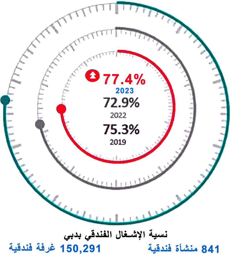 وبلغ متوسط نسبة الإشغال الفندقي في دبي حوالي 77.4% في عام 2023، وهي من أعلى المعدلات في العالم، ارتفاعاً من 72.9% في عام 2022، متجاوزةً نسبة الإشغال البالغة 75.3% المسجلة في العام 2019، وتعتبر النسبة المرتفعة للعام الماضي إنجازاً استثنائياً نظراً للزيادة الإجمالية ونسبتها 19%في عدد الغرف الفندقية في العام 2023 مقارنة بالعام 2019.